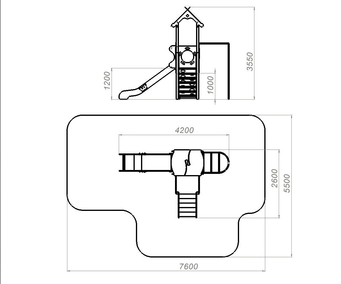 Детский игровой комплекс представляет собой модульную конструкцию, состоящую из центральной башни и полубашни. К центральной башне, с высотой площадки 1.2 м, примыкает горка-скат, небольшой рукаход который заканчивается шестом и большая альпинистская стенка. К полубашне, с высотой площадки 1,0 м, пристроена входная лестница. Игровая площадка собрана на металлических несущих столбах сечением 80х80 мм. Полы игрового комплекса выполнены с применением ламинированной противоскользящей водостойкой фанеры. Скат изготовлен из единого листа нержавеющей стали толщиной 1,5 мм, утопленный в пазы бортов горки. Борта горки, выполненные из водостойкой фанеры толщиной 21 мм. Защитная перекладина горки-ската, побуждающая ребенка присесть, выполнена из металлической трубы диаметром 27 мм.