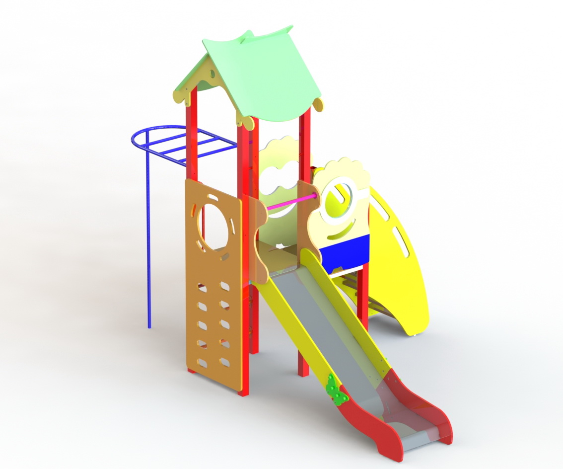 Детский игровой комплекс представляет собой модульную конструкцию, состоящую из центральной башни и полубашни. К центральной башне, с высотой площадки 1.2 м, примыкает горка-скат, небольшой рукаход который заканчивается шестом и большая альпинистская стенка. К полубашне, с высотой площадки 1,0 м, пристроена входная лестница. Игровая площадка собрана на металлических несущих столбах сечением 80х80 мм. Полы игрового комплекса выполнены с применением ламинированной противоскользящей водостойкой фанеры. Скат изготовлен из единого листа нержавеющей стали толщиной 1,5 мм, утопленный в пазы бортов горки. Борта горки, выполненные из водостойкой фанеры толщиной 21 мм. Защитная перекладина горки-ската, побуждающая ребенка присесть, выполнена из металлической трубы диаметром 27 мм.